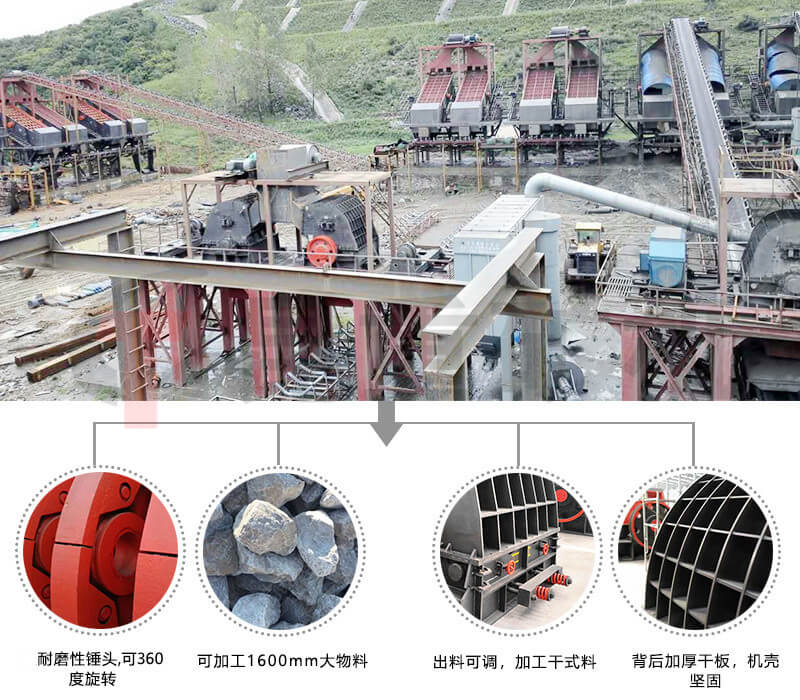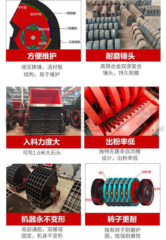 重錘式破碎機(jī)采用無蓖條設(shè)計(jì),產(chǎn)量大,無堵塞,出料可調(diào)。一破成型替代顎式破碎機(jī)與反擊式破碎機(jī)的聯(lián)合作業(yè)與傳統(tǒng)錘破相比,昆重礦機(jī)采用獨(dú)特?zé)o蓖條設(shè)計(jì),通過調(diào)整活動(dòng)反擊板與轉(zhuǎn)子上錘頭回轉(zhuǎn)軌跡圓之間的距離,調(diào)整出料粒度的大小,大大降低出粉率,揚(yáng)塵大大減少,更環(huán)保實(shí)用。進(jìn)料口大具備鄂破可以吃大料功能,同時(shí)具備反擊破整形功能。同時(shí)可破碎濕料,下雨天不影響生產(chǎn),解決了傳統(tǒng)錘破易堵塞、易卡機(jī)、產(chǎn)量低的難題。