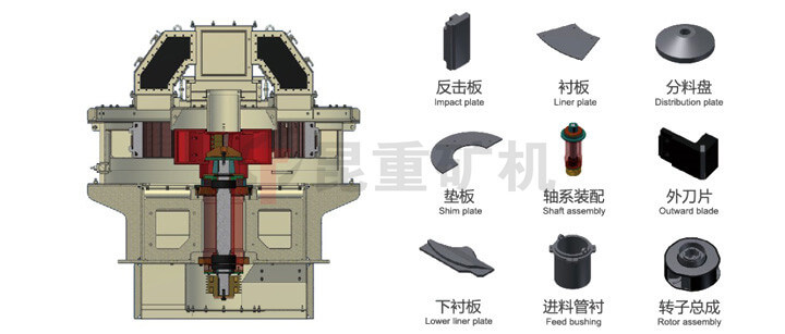 3、沖擊式制砂機(jī)易損件消耗低,合理的腔形設(shè)計,減少物料與易損件的直接接觸,更大的降低易損件的磨損。