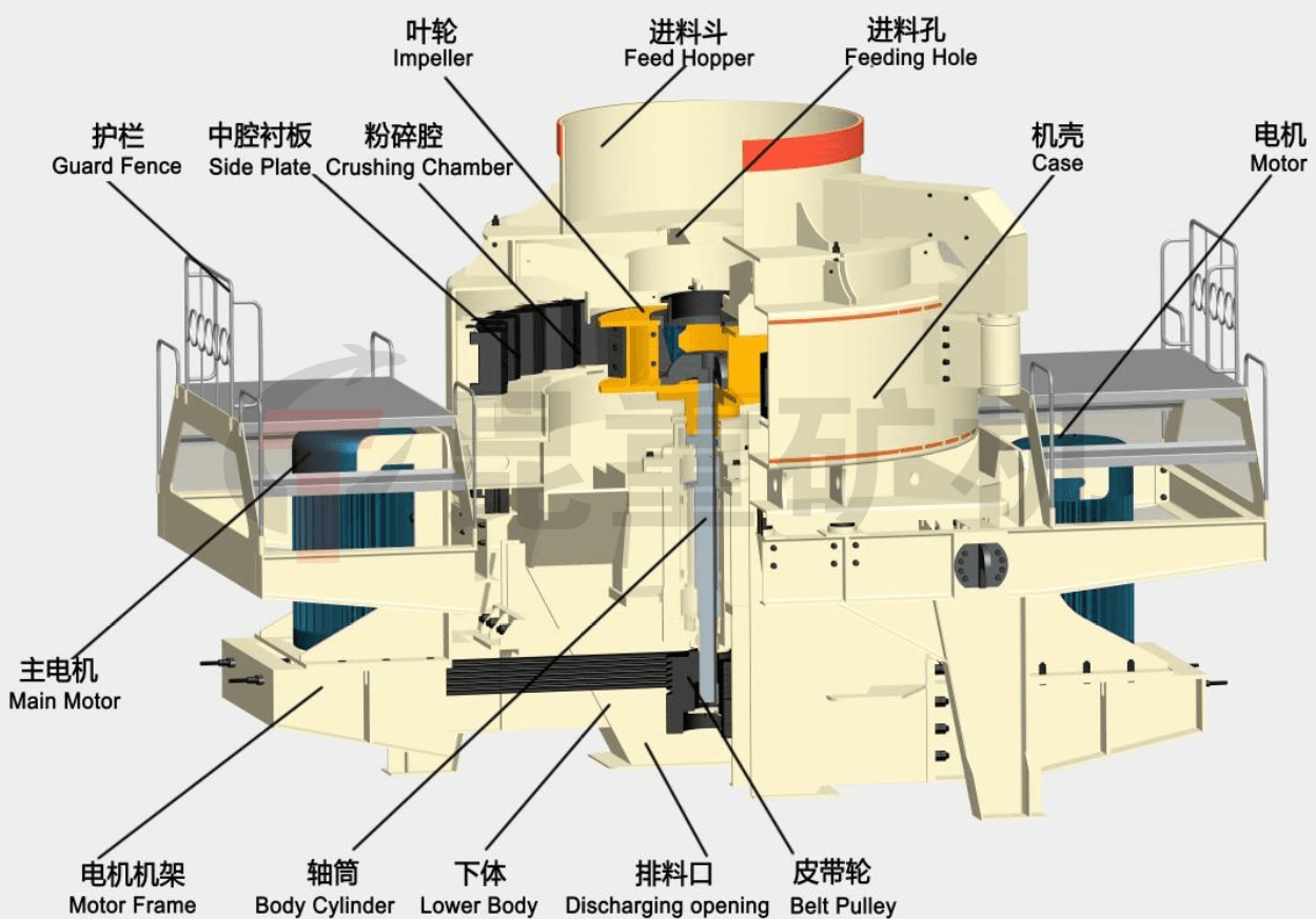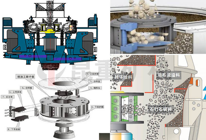 全中心進料:物料落入制沙機進料斗,經(jīng)中心進料孔進入高速旋轉的甩輪,在甩輪內被迅速加速,其加速度可達數(shù)十倍重力加速度,然后高速從甩輪內拋出,首先與反彈后自由下落的另一部分物料進行撞擊,然后一起沖擊到物料襯層(石打石)或反擊塊(石打鐵)上,被反彈斜向上沖擊到渦流腔的頂部,又改變其運動方向,偏轉向下運動,又與從葉輪流道發(fā)射出來的物料撞擊形成連續(xù)的物料幕。這樣,一塊物料在渦流破碎腔內受到兩次至多次幾率撞擊、摩擦和研磨破碎作用,被破碎的物料由下部排料口排出。