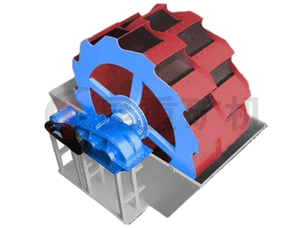 輪式洗砂機工作時,電機通過三角帶、減速機、齒輪減速后帶動葉輪緩慢轉(zhuǎn)動,砂石有給料槽進入洗槽中,在葉輪的帶動下翻轉(zhuǎn)、攪拌、淘洗,并互相研磨,除去覆蓋砂石表面的雜質(zhì),同時破壞包覆砂粒的水汽層,以利于脫水;同時加水,形成強大水流,及時將雜質(zhì)及比重小的異物帶走,并從溢出口洗槽排出,完成清洗作用。干凈的砂石由葉片帶走,砂石從旋轉(zhuǎn)的葉輪倒入出料槽,完成砂石的清洗作業(yè)。