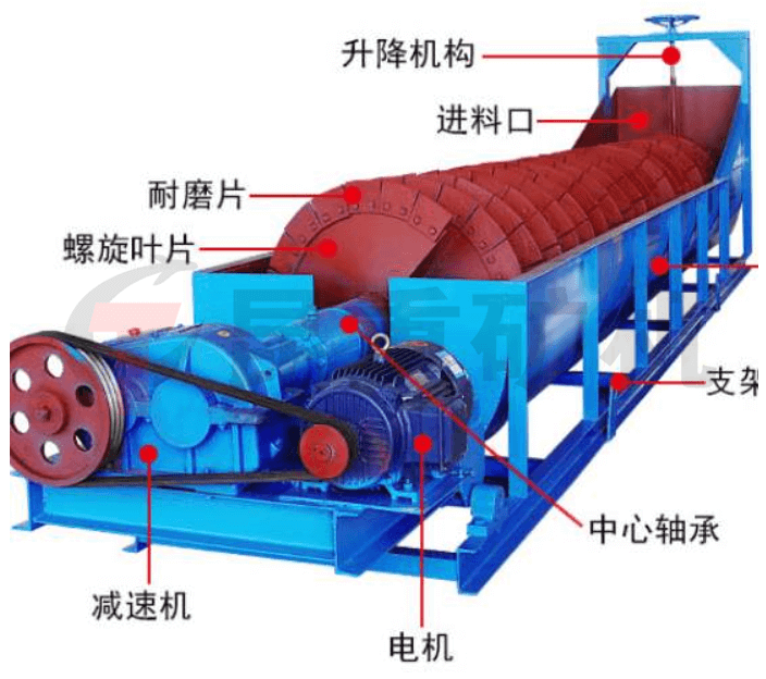 機(jī)器轉(zhuǎn)子采用中心結(jié)構(gòu),螺旋葉片安裝在中心軸上,有減速機(jī)連接到中心軸上進(jìn)行工作。借助固體顆粒的比重不同,因而在液體中沉降得速度不同的原理,進(jìn)行洗選的設(shè)備。物料由給料箱均勻給入,連續(xù)給主槽體中注入一定量的水,傳動部帶動螺旋軸以一定的速度旋轉(zhuǎn),迫使物料在槽體中翻轉(zhuǎn)滾動并向排料口運動,細(xì)粒級物料和雜質(zhì)隨溢流水經(jīng)溢流堰排出,粗粒度物料由排料口排出,從而實現(xiàn)物料的洗選、分級、除雜和脫水。