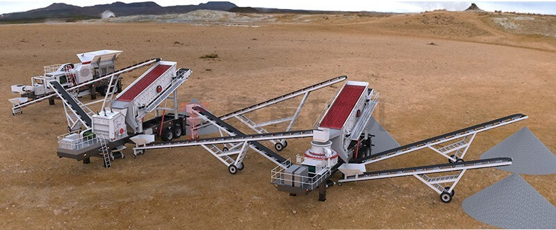 給料+顎破、圓錐破+篩分、制砂機(jī)+篩分,三臺車組合現(xiàn)場: