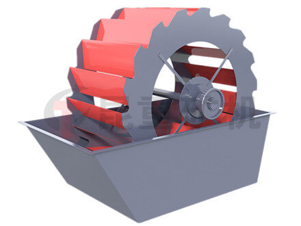 輪式洗砂機工作時,電機通過三角帶、減速機、齒輪減速后帶動葉輪緩慢轉(zhuǎn)動,砂石有給料槽進入洗槽中,在葉輪的帶動下翻轉(zhuǎn)、攪拌、淘洗,并互相研磨,除去覆蓋砂石表面的雜質(zhì),同時破壞包覆砂粒的水汽層,以利于脫水;同時加水,形成強大水流,及時將雜質(zhì)及比重小的異物帶走,并從溢出口洗槽排出,完成清洗作用。干凈的砂石由葉片帶走,砂石從旋轉(zhuǎn)的葉輪倒入出料槽,完成砂石的清洗作業(yè)。