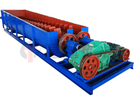 雙軸洗石機的給料是從槽體的下端給入,粘結(jié)在一起的砂石泥團被洗礦葉片連續(xù)的攪拌、擦洗,并受到上端高壓沖洗水的沖洗和松散作用,迫使粘性泥土與物料顆粒解離,黏士形成懸浮狀態(tài)的礦漿由下部溢流槽排出,粗粒物料顆粒則受到葉片的推動作用,從洗石機上部的排料口排出。